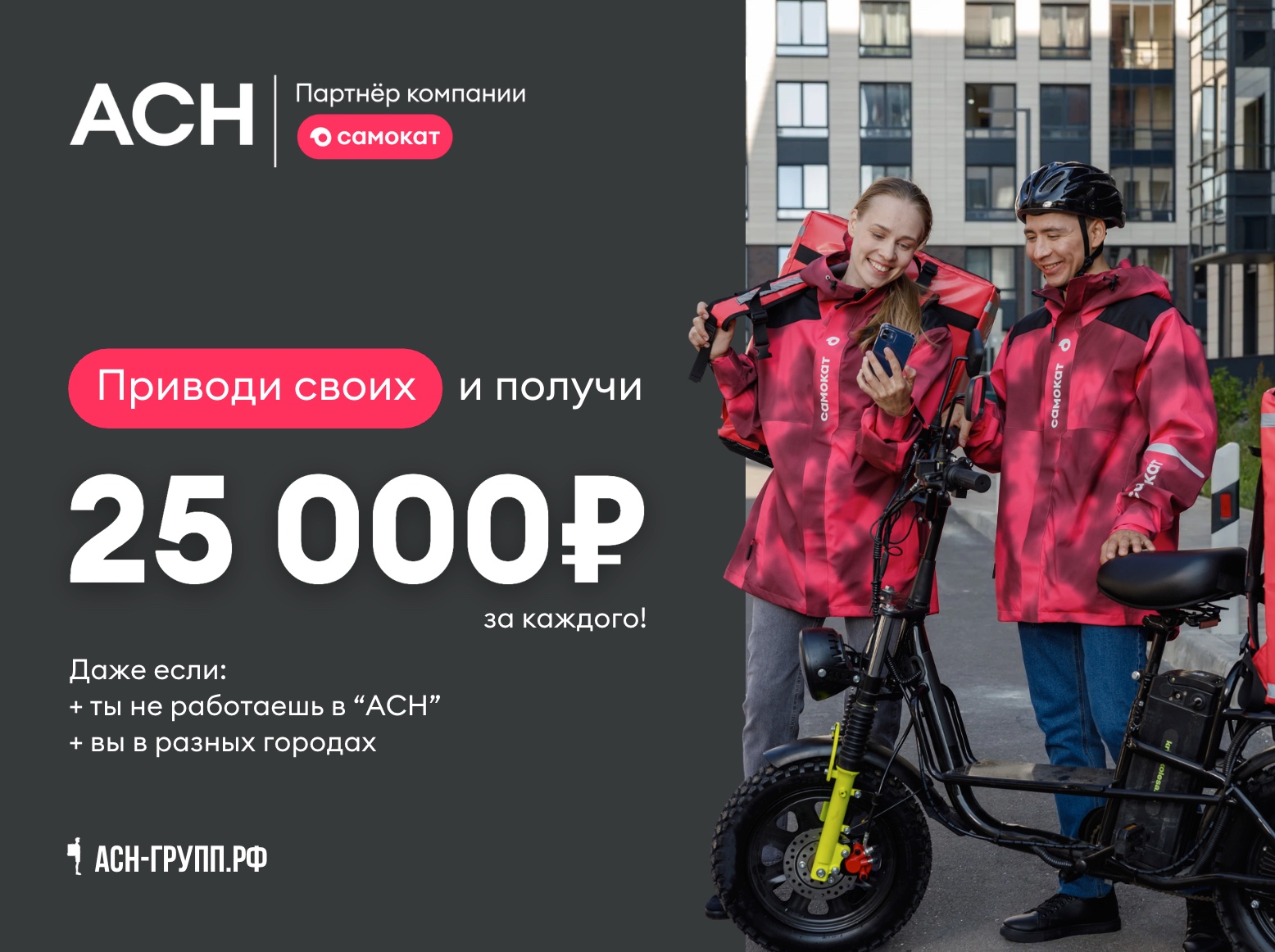 Знаешь, что самый легкий способ заработать в Самокате? Реферальная программа АСН дарит тебе шанс получить приличный бонус просто за то, что поделишься классной возможностью.